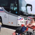 今年度から部会に参加している西宮の古川さん。古川さんはストレッチャー式の車いすを利用され、座位も難しい人です。会議でも、乗れるかどうかみんなで考えました。でもやってみないと分からないよねと、ポートアイランドにあるJRバス神戸営業所まで行き試乗にチャレンジしました。車椅子ユーザー、支援者総勢10人近くになりました。JRの方も乗務員を始め多くの人が話しを聞いて下さったり、バスの試乗を手伝ってくれたり、トランクに車椅子を入れるのに意見交換したり、全員汗だくでした。介護者からも提案してもらったりしましたが、しかし結果的に古川さんは乗れませんでした。乗車口が狭いこと、段差が高いこと、運賃箱があり入れない事、仮に座席に座れても前が狭く身体への負担が強いこと、本当に残念でしたが古川さんだけが、高速バスでなく、明石からジェノバラインに乗り、岩屋港から党内の路線バスで行く事になりました。他5人の車いすユーザーは何とか乗れましたが、乗車口の段差が高く介護者の負担がかなり強く、障害者も身体に痛み等が生じる等、交流会で報告されました。やっばりリフト付きバスが必要です。